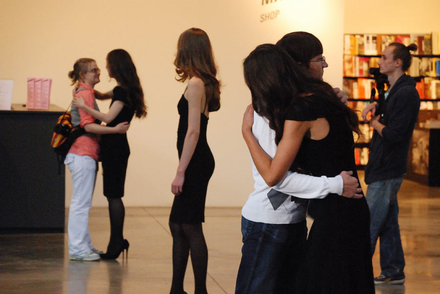Описание: 4-5 девушек в черных платьях встречают зрителей у входа в Гараж. Они,