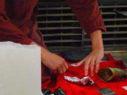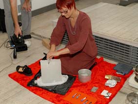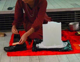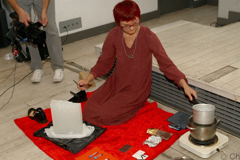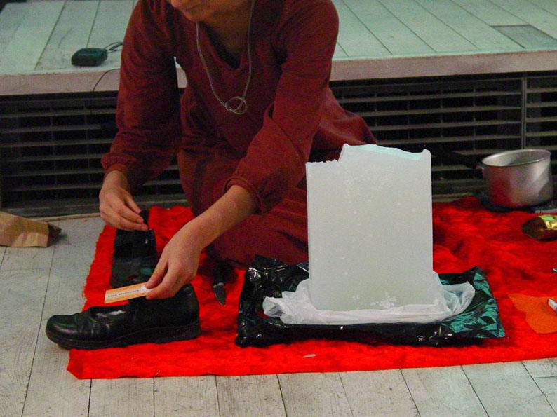 Action: I fuse the soap base on the water bath, add the ingredients (my blood, nails and hair). I put the substance into the forms: my own shoes, put my visit cards on it.