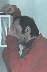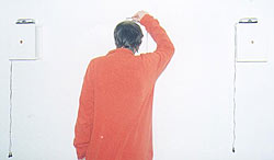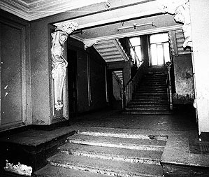 В том же духе оформлены и сами работы - дюжина совершенно одинаковых белых ящиков с встроенными в переднюю стенку дверными глазками, сквозь которые мы и видим интерьеры парадных. Эти глазки сильно ограничивают поле зрения, а главное - стушевывают края снимков, суггестируя тем самым продолжение иллюзорного пространства за пределы поля видимости.