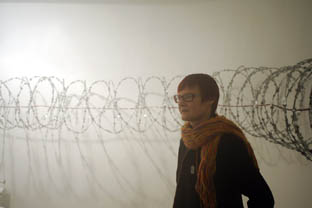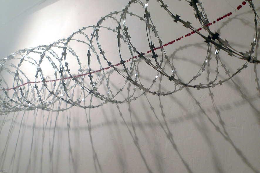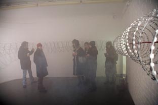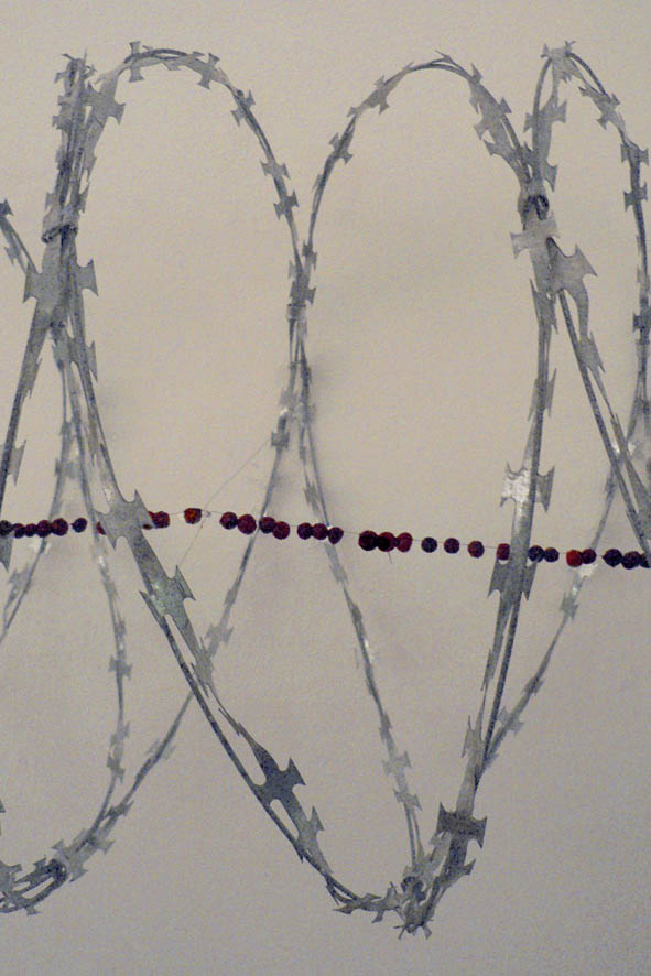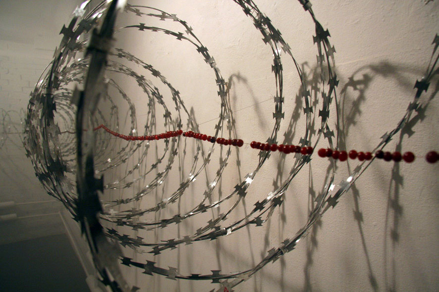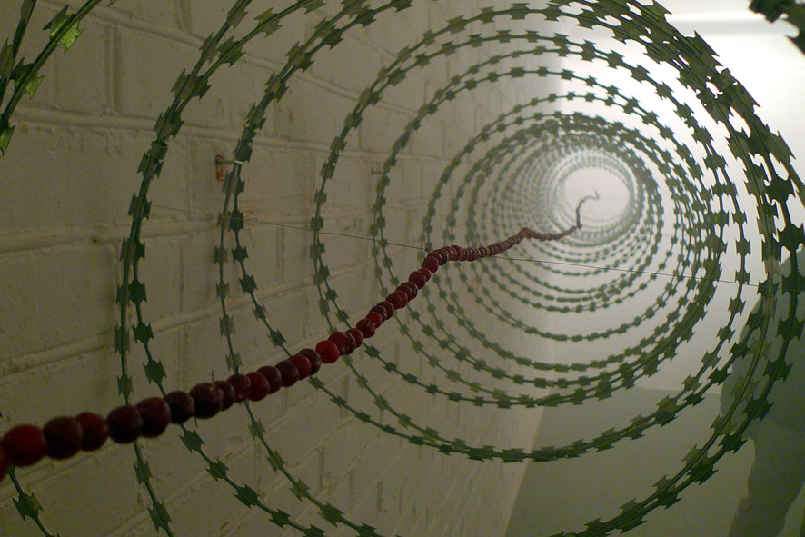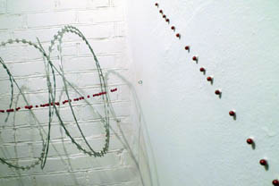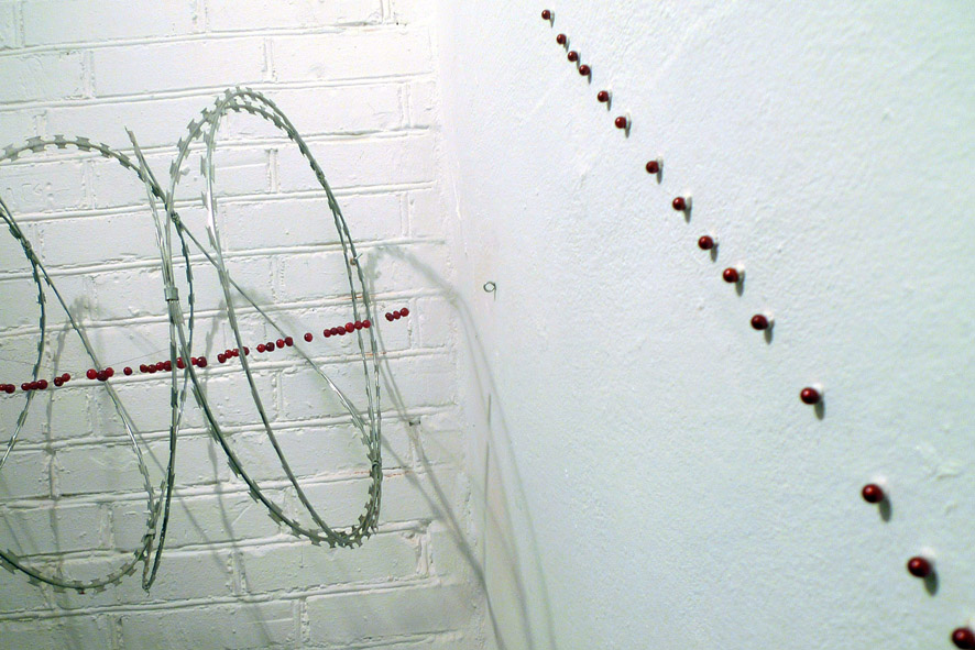 Работа представляла собой инсталлированную по всему периметру зала галереи спираль из колючей проволоки, внутри которой по центру была протянута нить с нанизанными на нее ягодами клюквы. На одной из стен эта конструкция прерывалась диагональной, проведенной слева направо пунктирной линией  из бусинок,  также напоминавших ягоды клюквы. Важный визуальный эффект, создавший особую атмосферу выставки и  оптику, -  туман, продуцируемый с помощью специальной туман-машины. Благодаря нему, все происходящее было покрыто  белой дымкой:  чтобы что-то увидеть, зрителю приходилось подойти вплотную к рассматриваемому объекту.