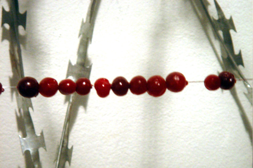 Нанизанные ягоды-бусины визуально напоминают «узелки на память» или четки, создающие  ритм для внутренней жизни человека. Таким образом, «узелковая» нить  - утопическая попытка  воссоздания  прерванной коммуникации, устранения  травмы прошлого и культурного разрыва.