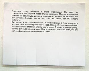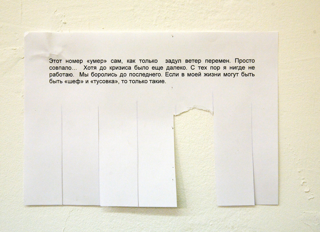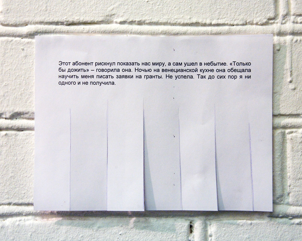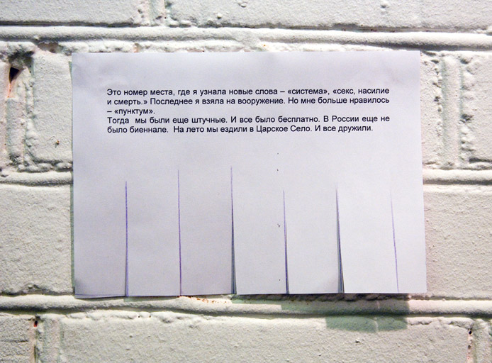«Что такое узел? Узел фиксирует  место разрыва, зияния или имитирует этот разрыв. Это памятник над тем, что утеряно. Если перенести его на тело, где и положено располагаться настоящему симптому, то узел - это рубец. Рубеж, зарубцевавшееся место отруба. Зарубка на память. Видимый след-память утраты, раны, ущерба, нехватки. Памятник травме. Рубец возникает там, где произошел обрыв коммуникации. Чем плотнее, заметнее рубец, тем глубже рана под ним, за ним в прошлом», - пишет в пресс-релизе к выставке профессор семиотики  Тартусского университета Е.Мельникова-Григорьева.