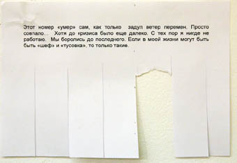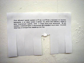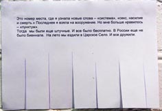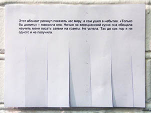 Впрочем, при определенных условиях узел можно как завязать, так и развязать. Судя по тому, что Лиза предлагает в качестве ключа к пониманию материальной стороны акции аббревиатуру, которую она трактует, скорее, как сакральную анаграмму или мантру первой строчки известного петербургского текста О.Мандельштама, сосчитанные узлы должны воскресить мертвецов подобно тому, как Симонид Кеосский воскрешал в своих мнемонических экзерсисах милые прахи за деньги.