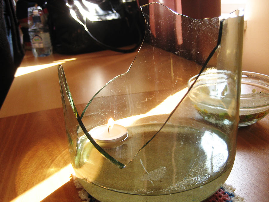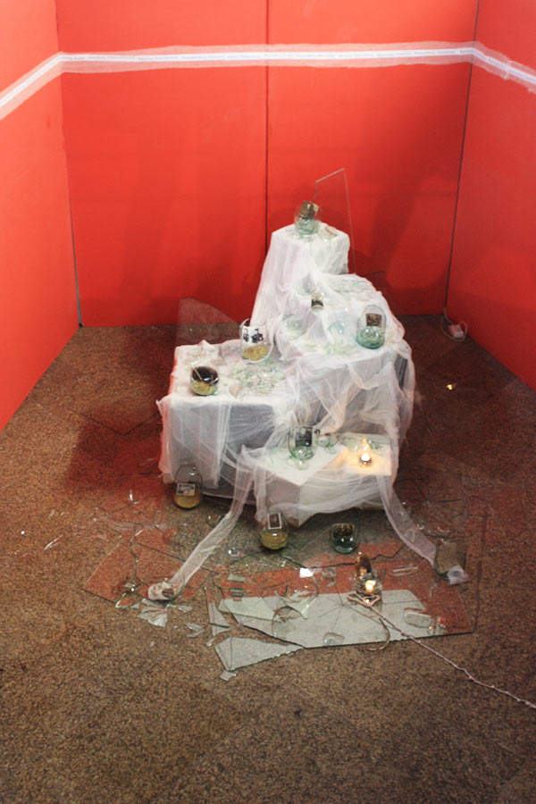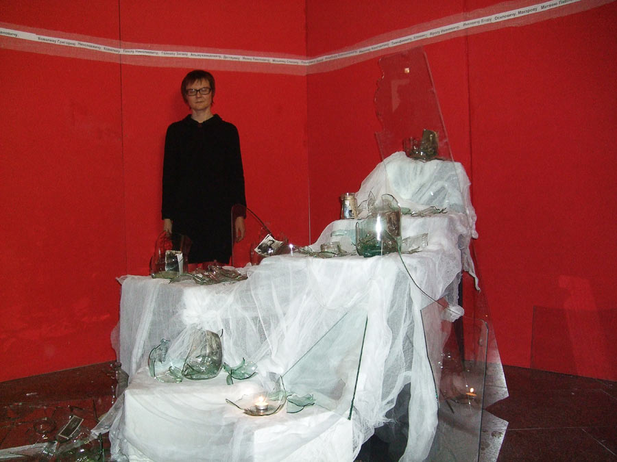Узелки, завязанные на бинте — путеводная нить для зрителя, входящего в инсталляцию по темному коридору, напоминающему родовой канал, наощупь, создающая для него возможность инициации. Эта нить — не только женский дневник, но и пуповина, связывающая зрителя с произведением, настоящее — с прошлым, а также своебразные четки, создающие ритм внутренней жизни героини (санитарки). Ее опыт, воспоминания передаются тактильным способом зрителю и приводят его к главному объекту — мемориалу памяти и боли, созданному из бинта и битого стекла, в который включены документальные фотографии. Бинт имеет не только медицинские коннотации, но выражает изначальное женское стремление заботиться, укутывать, пеленать. Битое стекло буквально метафоризирует разбитые жизни и судьбы.