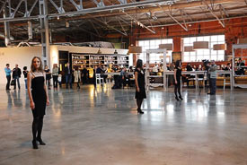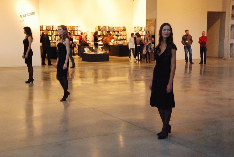 Описание: 4-5 девушек в черных платьях встречают зрителей у входа в Гараж. Они,