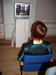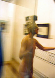 Действие: Я обнажена. Включенная видеокамера прикреплена к моей голове таким образом, что лишает меня зрения. Я медленно двигаюсь на ощупь через пространство зала музея. Во рту я держу разноцветные бусинки, с помощью которых отмечаю свои тактильные ощущения от воспринимаемого - встречающихся на моем пути предметов и людей. Конечная точка моего пути - видеомонитор, находящийся в противоположном конце выставочного помещения.